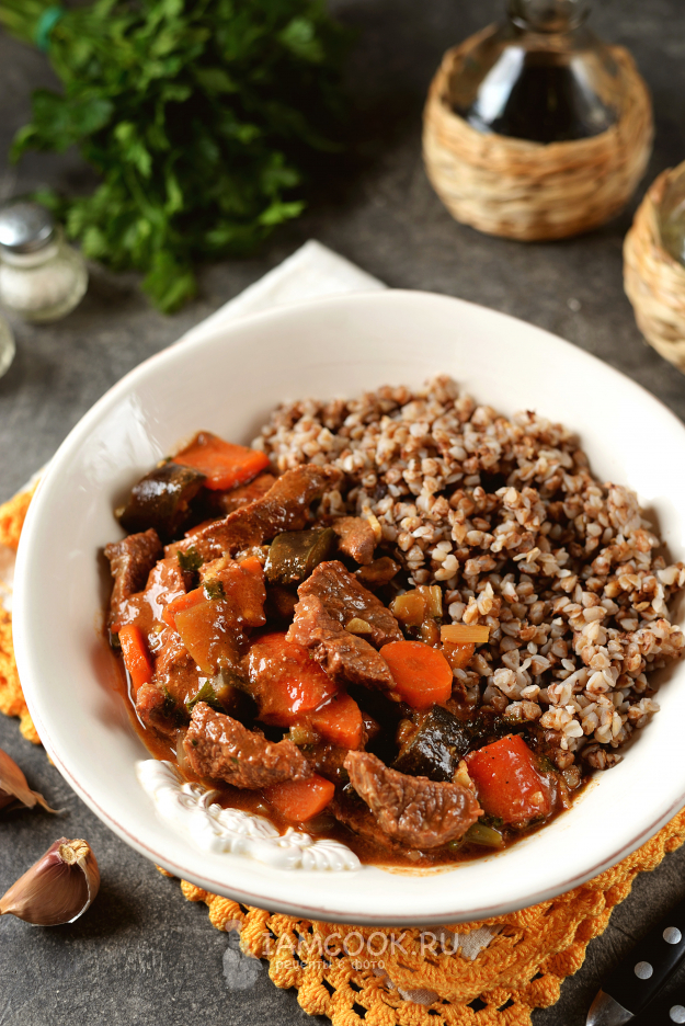 Гречка с гуляшом из говядины с подливой готовы к подаче на стол. Приятного.