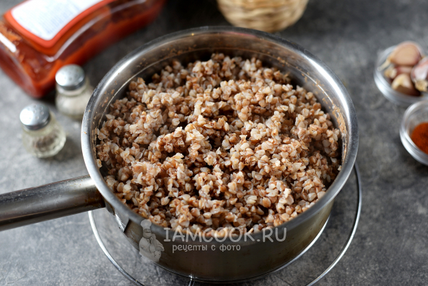 Параллельно промойте гречку, залейте ее водой в пропорции 1 к 3, чуть подсолите. Варите на тихом огне минут 15 до полного испарения воды. Готовую крупу разрыхлите вилкой.