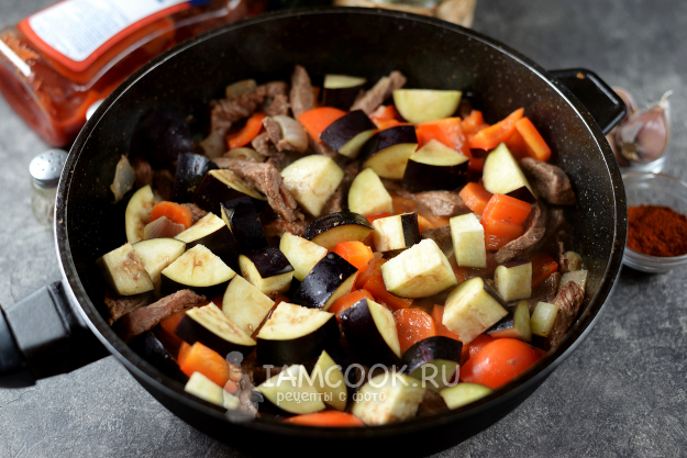 Баклажан нарежьте крупным кубиком, всыпьте в сковороду, аккуратно все перемешайте, влейте еще воды и тушите под крышкой около 10 минут.