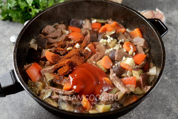 Чеснок мелко порубите, положите в сковороду вместе с паприкой и томатным соусом любимого производителя. Тушите 5-7 минут, затем посолите и поперчите блюдо по вкусу.