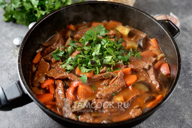 Нарубите любую свежую зелень, всыпьте ее в сковороду, аккуратно перемешайте и выключите плиту. Оставьте гуляш под крышкой минут на 15 настояться, чтобы говядина впитала в себя все вкусы овощей и ароматы приправ. Иногда траву кладут прямо в тарелку каждому, а не в общее блюдо.