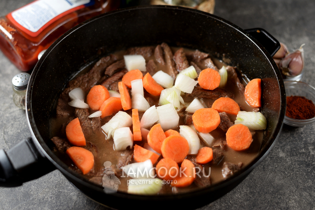 Попробуйте ломтик на вкус: если говядина уже достаточно мягкая, можно продолжить приготовление. Положите в сковороду крупно порезанные лук и морковь, продолжайте тушить на тихом огне минут 10. При необходимости подливайте воду.