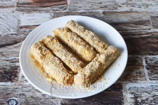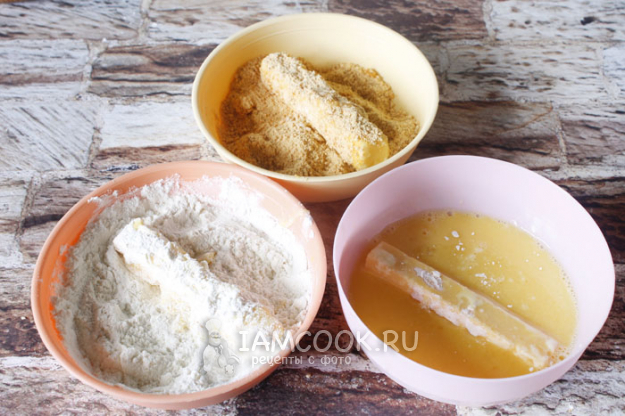 Берем по одной палочке, обмакиваем их попеременно в муку, затем в яйцо, снова в муку и в яйцо и в конце обильно обваливаем в сухарях. Палочки можно брать не руками, а щипчиками.