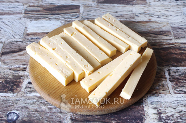 Сыр нарезаем на одинаковые брусочки - у меня получилось 12 штук длиной примерно 10 см и толщиной 1 на 1 см.