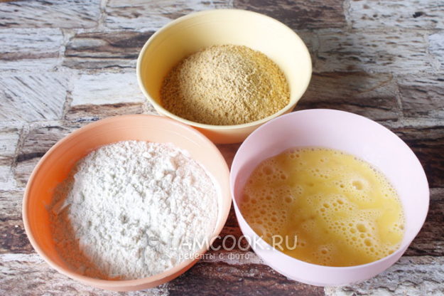 Берем три мисочки: в одну насыпаем муку, в другую - сухари, в третью разбиваем яйца и взбиваем их вилочкой до однородности.