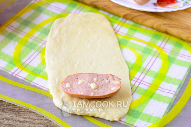 Заверните сардельку в тесто, скрутите рулетом, в конце защипывая края.