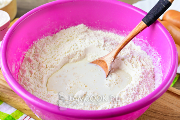Сделайте углубление в муке и влейте молочно-дрожжевую жидкость.