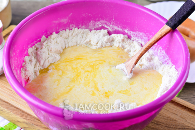 В масляно-яичную смесь влейте кефир комнатной температуры. Перемешайте эти компоненты.
