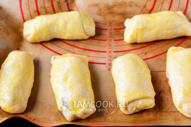 Выложите сардельки в тесте на противень, каждое изделие смажьте взбитым желтком, смешанным с молоком (1 ст.л.). Оставьте на 3-4 минуты, чтобы смазка подсохла, а пока включите духовку на разогрев.