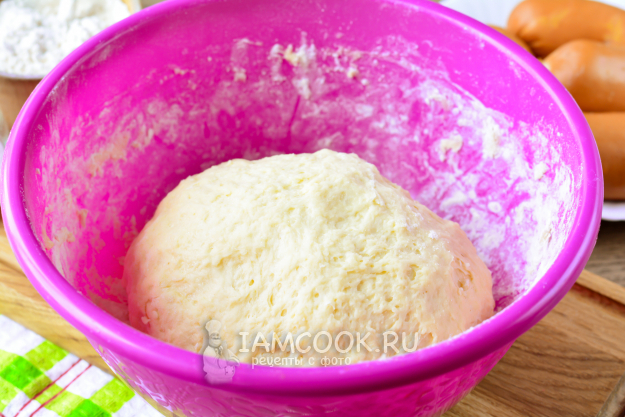 Пока тесто поднимается, почистите от пленок сардельки. Можете разрезать сардельки вдоль и пополам, если они сильно крупные. Это по желанию.