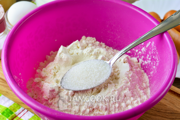Просейте пшеничную муку в миску и всыпьте к ней соль, сахар.