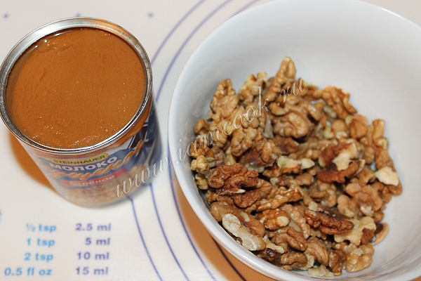 Смешаем ореховую крошку с вареной сгущенкой. Как следует все перемешаем.