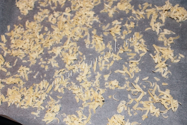Мороженное тесто натрем на крупной терке, а затем равномерно распределим по листу бумаги для выпекания, как на фото. Выпекаем в два захода по 10 минут при 160 градусах, до золотистого цвета.