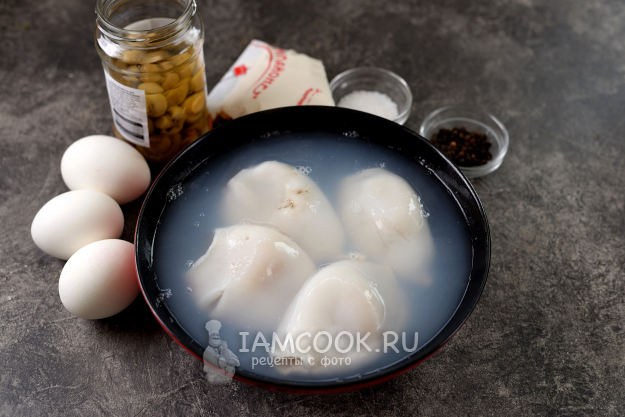 Небольших кальмаров можно не отваривать, просто залейте их кипятком несколько раз, затем слейте воду, очистите тушки от пленки, удалите хитиновую жилку внутри.