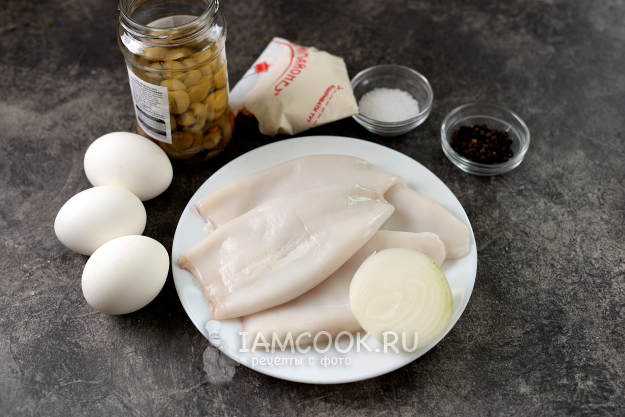 Подготовьте продукты для салата «Нежность» с кальмарами, яйцами и шампиньонами. Кальмаров предварительно разморозьте. Яйца отварите не дольше 10 минут, остудите в холодной воде. Шампиньоны лучше брать в собственном соку, хотя маринованные отлично сочетаются с пресными кальмарами.