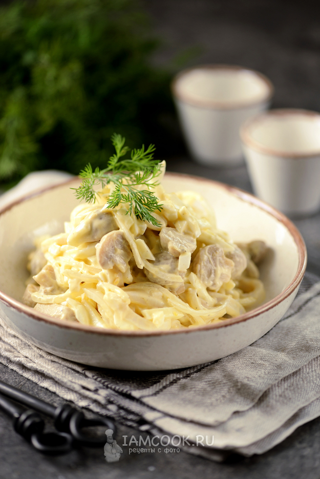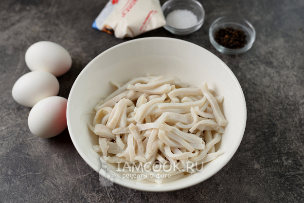 Остывших кальмаров нарежьте соломкой, переложите к грибам.