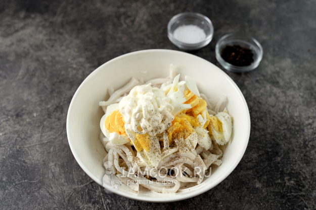 С помощью яйцерезки измельчите яйца также соломкой. Добавьте немного соли и перца, заправьте небольшим количеством майонеза хорошего качества. Аккуратно перемешайте и дайте пару-тройку минут постоять перед подачей.