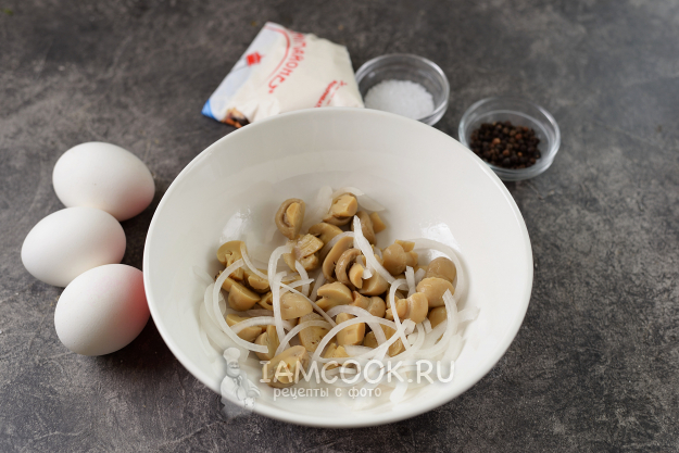 Если грибочки мелкие, разрежьте их пополам, если крупные - пластинками. Сладкий лук нарежьте полукольцами, перемешайте. Пока кальмары будут готовиться в кипятке, лук немного замаринуется. В некоторых вариантах этого салата встречается зеленый лук: если будете его класть, то только зеленые перья, белая часть слишком ядреная.