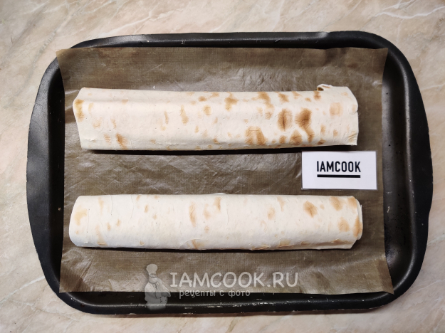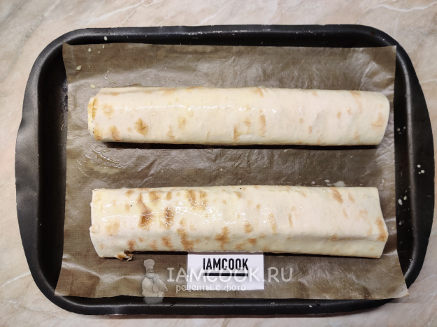 Рулеты выложите на противень, застеленный пергаментной бумагой или смазанный каплей подсолнечного масла.