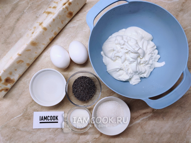 Для начала подготовьте все необходимые ингредиенты для рулета из лаваша с творогом и маком. Творог подойдёт как крупинчатый, так и более мягкий. Вместо сахара можно использовать сахарозаменитель, который подходит для термообработки.