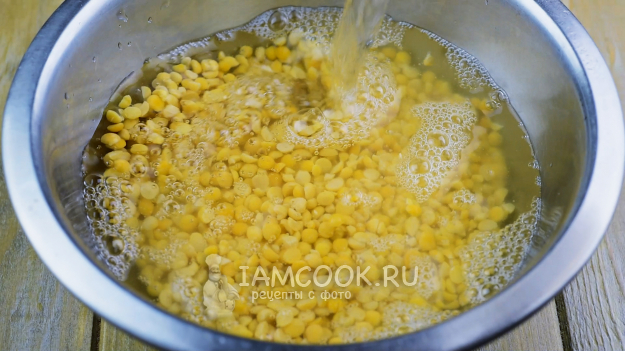 Горох выложить в миску, залить холодной водой и замочить на 2 часа.