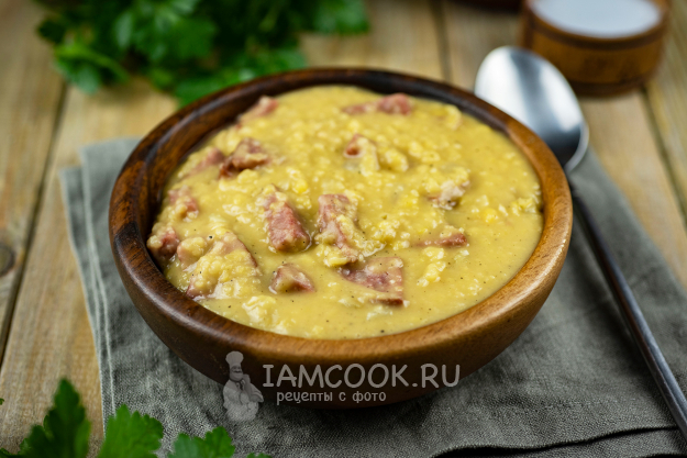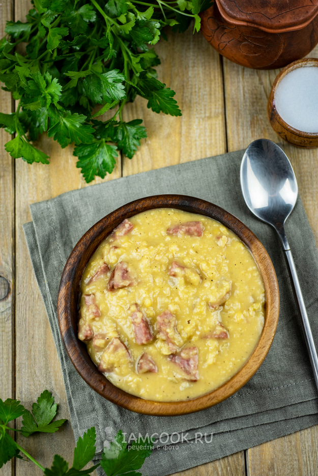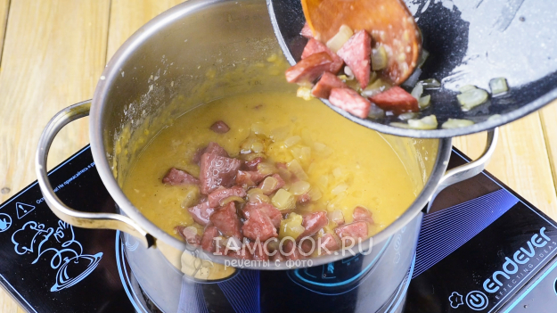 Обжаренную колбасу с луком выложить в кастрюлю к разваренному гороху. Перемешать все и через 5 минут снять кастрюлю с готовой кашей с плиты.