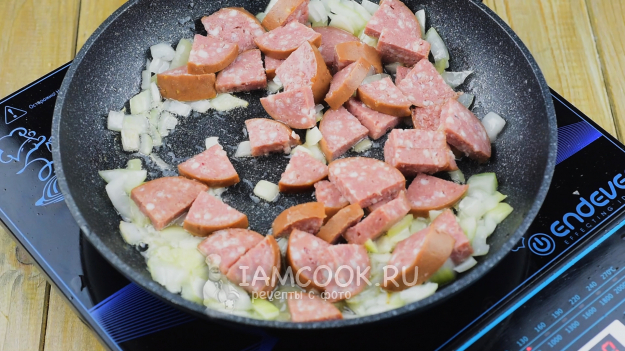 В сковороду к луку добавить порезанную небольшими кубиками колбасу и обжаривать все вместе еще 5 минут, постоянно помешивая.