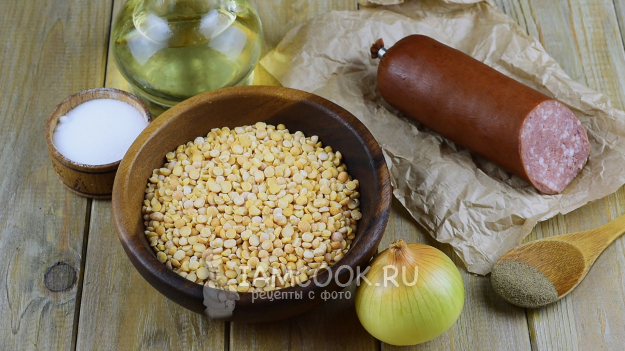 Подготовить необходимые ингредиенты для гороховой каши с колбасой. Лук почистить.