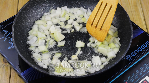 Мелко нашинковать луковицу, обжарить в растительном масле на сковороде до мягкости на среднем огне, постоянно помешивая.