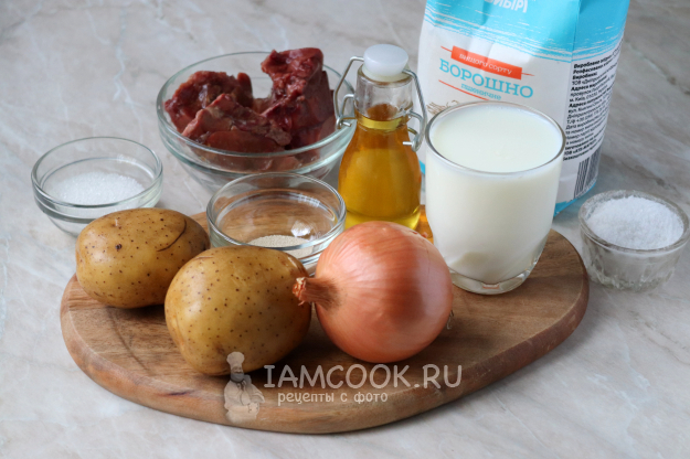 Для приготовления пирожков с печенью и картошкой в духовке необходимы следующие ингредиенты. Молоко должно быть тёплым, но не выше 40 градусов, иначе дрожжи погибнут. Пшеничную муку просейте дважды через мелкое сито, чтобы насытить её кислородом и избавиться от всевозможного мусора.
