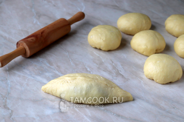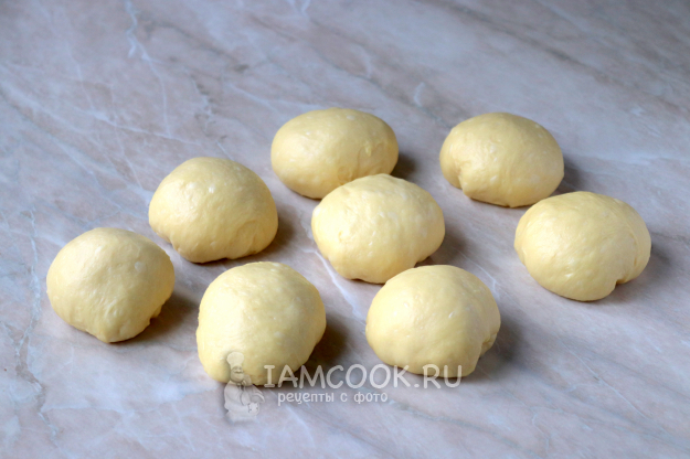 Обомните его и разделите на 8 равных частей, по 90 граммов каждый. Для точности я использовала кухонные весы.