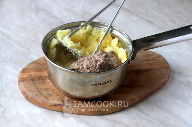 Когда картофель будет готовым, слейте воду, в котором он варился, а картошку разомните толкушкой. Затем добавьте к нему печёночную массу и хорошо перемешайте. Соль и перец добавьте по вкусу.