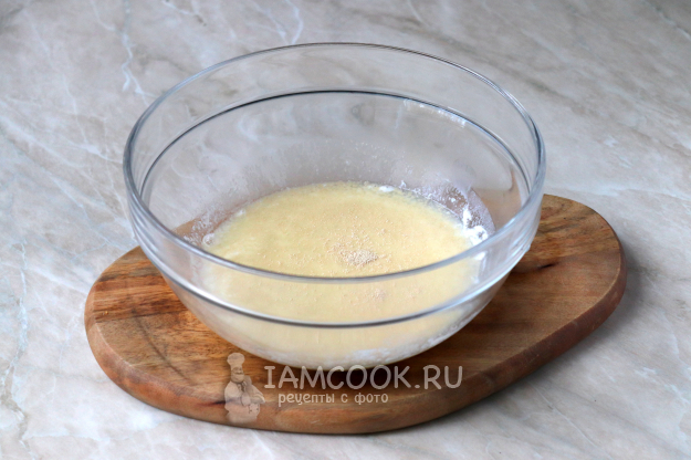 В глубокой миске соедините молоко, сахарный песок и сухие дрожжи. Перемешайте и оставьте на 10 минут до появления на поверхности пенной шапочки.