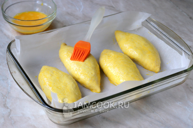 Затем выложите их в жаропрочную форму, застеленную пергаментом, швом вниз. Накройте полотенцем и оставьте на 10-15 минут для повторного подхода. После чего поверхность пирожков смажьте взбитым яйцом и посыпьте кунжутом.