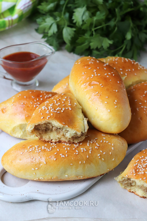 Отправьте форму с заготовками в разогретую до 180 градусов духовку на 30-35 минут. Время приготовления будет непосредственно зависеть от вашей духовки, ориентируйтесь по цвету. Выпечка должна приобрести равномерный золотистый цвет. Готовые пирожки переложите на металлическую решётку, чтобы они немного остыли.