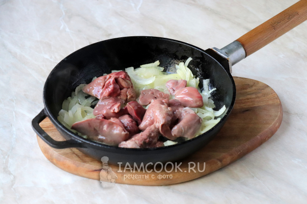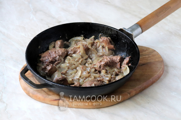 Пока картофель варится, очищенный лук нарежьте полукольцами и обжарьте на растительном масле до прозрачности, 5-7 минут, периодически помешивая. Затем добавьте к нему куриную печень и немного подсолите. Не забывайте, что предварительно её нужно промыть и удалить лишний жир и плёночки.