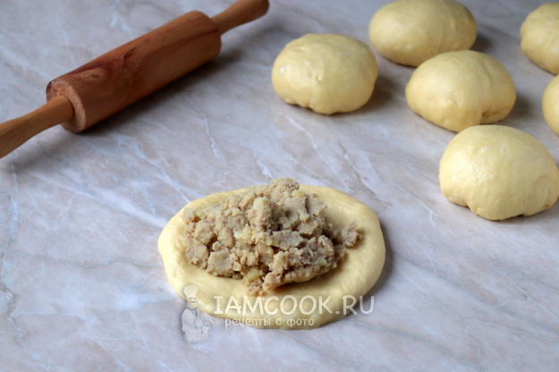 Каждый кусок теста раскатайте в тонкую лепёшку, в центр которой выложите по 1,5-2 ст.л. начинки.