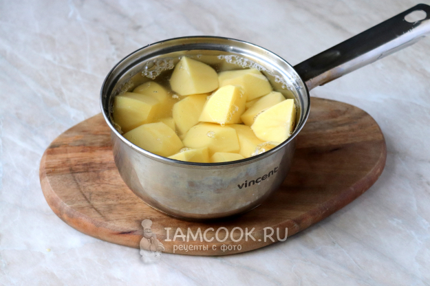 Тем временем займитесь начинкой. Картофель очистите и промойте под холодной водой. Крупные клубни разрежьте на 2-4 части. Выложите их в подходящую кастрюлю/сотейник, залейте доверху водой и отправьте на огонь. После закипания добавьте соль и варите на небольшом огне до мягкости. Время варки будет зависеть от сорта картошки, мне понадобилось 20 минут.