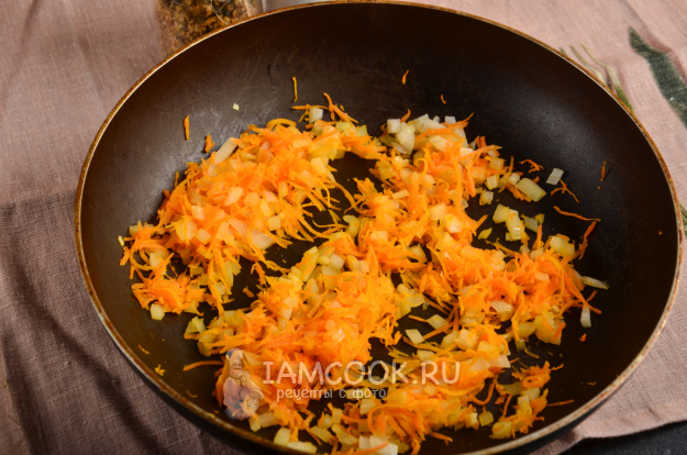 Для зажарки мелко нарубите луковицу, а морковь натрите на мелкой терке.