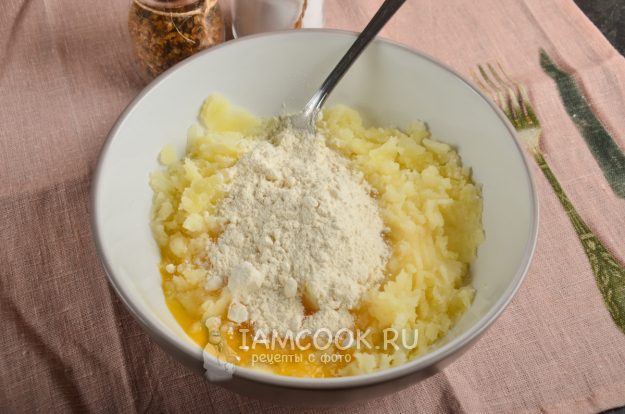 Всыпьте почти всю муку. Количество муки может колебаться, оно зависит от сочности (или сухости) картофеля, а также от размера яйца. Начинайте размешивать.