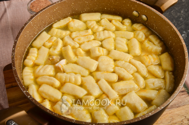 Рабочую поверхность присыпьте мукой. Отделите часть от основного куска теста, раскатайте в жгут и отрезайте небольшие кусочки. Помните, что во время варки ньокки увеличиваются в размерах. Совсем маленькие ньокки называются ньокетти.