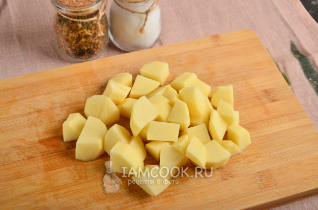 Картофель (3 шт.) нарежьте небольшими кусочками. Спустя 20-25 минут варки бульона отправьте овощ в кастрюлю.
