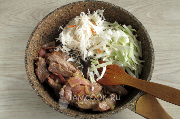 Сдвиньте мясную часть и отправьте на сковороду половину квашеной капусты и нашинкованной свежей.