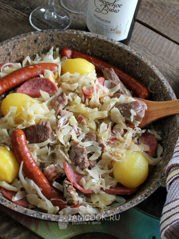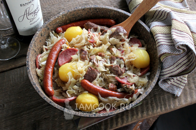Традиционно шукрут из квашеной капусты подается на большом блюде, на которое капуста с мясом выкладываются горкой, а рядом - колбасы и картошка. Но по-простому можно и прямо на сковороде...