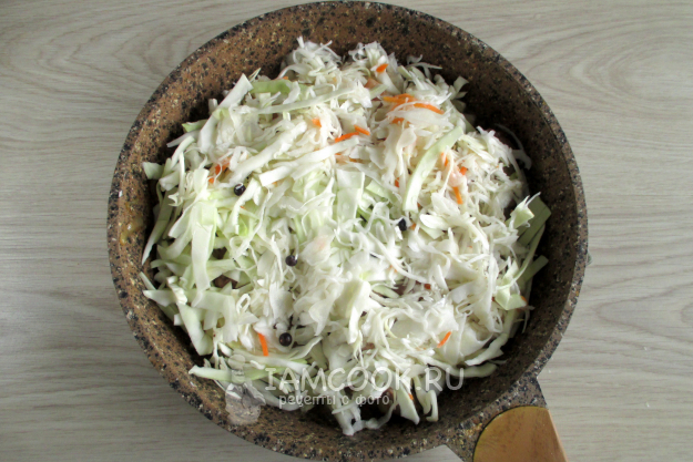 Переложите мясо на капусту так, чтобы на сковороде был сначала слой из капусты, сверху - мясо с луком и беконом, а третьим слоем - остальная часть/половина квашеной и свежей капусты. Залейте белым вином, добавьте ягоды можжевельника и горошины черного перца. На сильном огне доведите до закипания, убавьте огонь до слабого кипения и начните тушить под крышкой.