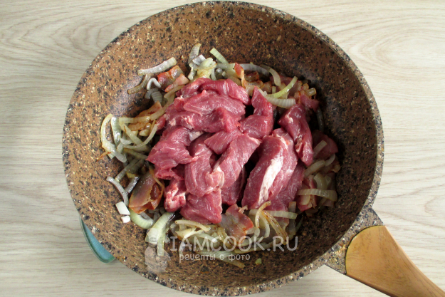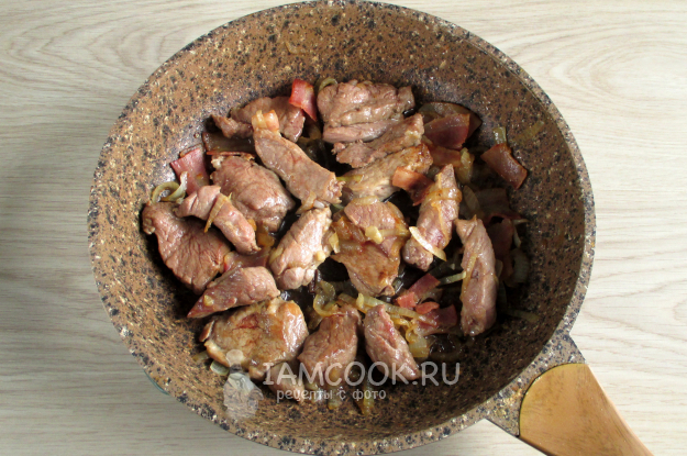 Свинину (тут шейка, с которой срезаны излишки жира) нарежьте на бруски толщиной около 2 см. Отправьте их и зубчики чеснока на сковороду к обжаренным луку и бекону.