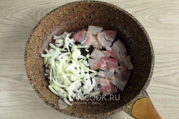 Обжарьте кусочки бекона и нашинкованный полукольцами лук. Делаю это одновременно на разных половинках одной сковороды. Наливаю растительное масло, добавляю лук, сдвигаю его в одну сторону, а на другую - кусочки бекона. Огонь для жарки будет сильный (но не максимальный!), поэтому не отходите и часто помешивайте и переворачивайте. Примерно минут пять.