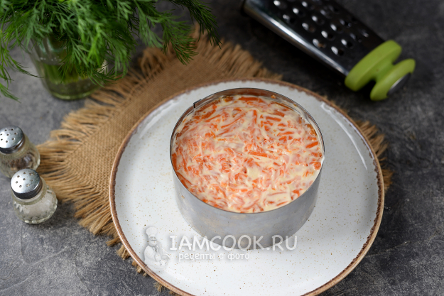 Следующими слоями положите натертые белки и морковь. Слой моркови также можно смазать майонезом и разровнять ложкой.