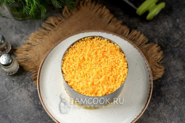 Желтки натрите на меленькой терке, посыпьте ими верх салата, накройте пищевой пленкой, дайте время настояться.