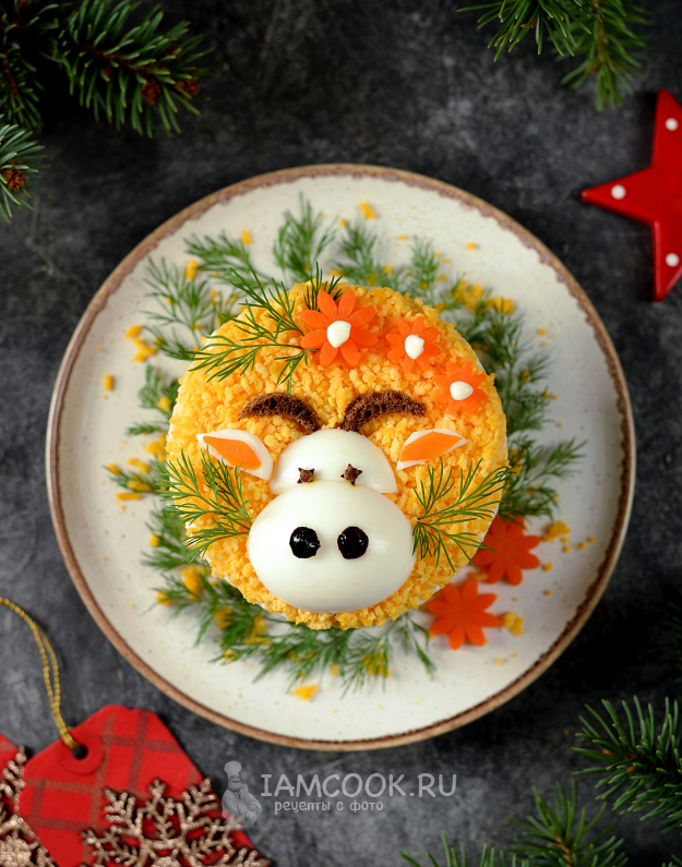 Выложите теленка сверху салата, рожки я решила поменять на хлебные, поскольку их не было видно на оранжевых желтках. А для ноздрей нашлась маслина. Украсьте всё укропом и цветочками из моркови - салат «Мимоза» на Новый год быка готов к подаче на стол.